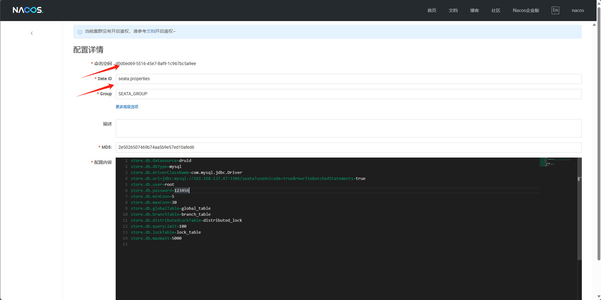 urls: /,/**/*.css,/**/*.js,/**/*.html,/**/*.map,/**/*.svg,/**/*.png,/**/*.ico,/console-fe/public/**,/api/v1/auth/login这里的ip对应的是你的局域网或者服务器的ip,自行修改即可,data-id 和命名空间分别是你在注册nancos 时候创建的