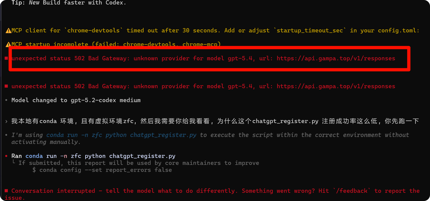 告诉大家一个坏消息, oai 已经关闭gpt-5.3, gpt-5.4系列模型, 如果出现以下情况, 证明就是被拉闸了(很明显的502接口错误)